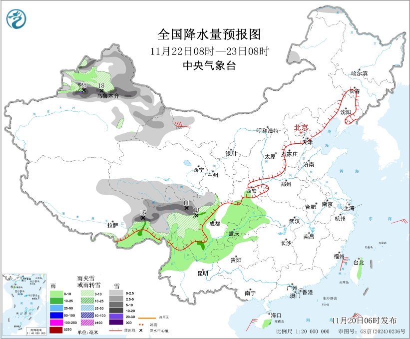 11月22日08時至23日08時,新疆北部和東部、甘肅西北部、青海南部、西藏東部、川西高原中北部等地部分地區有小到中雪或雨夾雪,其中,新疆沿天山地區和伊犁河谷、西藏東部、川西高原北部等地部分地區有大到暴雪,局地大暴雪(20~25毫米)。新疆伊犁河谷、西藏東南部、陜西南部、川西高原南部、云南北部、四川盆地東部和南部、貴州西部、重慶等地部分地區有小雨,局地有中雨。內蒙古西部、甘肅北部等地部分地區有5~7級風、陣風8~9級;南海北部和中部等部分海域將有5~7級風、陣風8級(見圖4)。